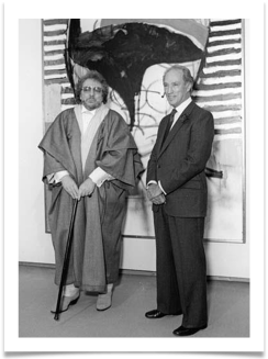 In 1966 Ronald was offered a programme on the arts, by CBC television producer, John Kennedy. He accepted and became host of “The Umbrella” run on Sunday afternoons. The programme which had its share of controversey lasted two seasons and had a viewing audience of 1.2 million. Afterwards Ronald turned to painting once more. Some of his flowing lineal murals were attracting attention. In 1967 Fred Lebensold, architect for the National Art Centre in Ottawa, was looking for an artist who could tackle a large scale colourful mural. He thought of Ronald. Unannounced he dropped into Ronald’s Toronto studio to invite him to submit a proposal for a mural. Ronald came up with one of his flowing lineal compositions measuring 44 x 60 feet (later entitled “Tribute to Robert F. Kennedy” chosen by Ronald to honour R.F.K. in the way a writer dedicates a book to a friend). The three-story mural is influenced by both landscape and music. The mural is widely admired by public and planners alike because of the difficult area the artist had to work with. While continuing with his painting career Ronald returned to broadcasting and hosted “Theme & Variations” in-depth interviews and music, CBC (1968); “As It Happens” six hours straight, interviews with people making the news, CBC (1969-72); “Free For All”, public access programme, CITY-TV, (1972-74, 1977). In 1975 Joan Murray, director of the McLaughlin Gallery and Kathryn Reid Woods organized the exhibition “Ronald: 25 years”. The show toured eight galleries across Canada.