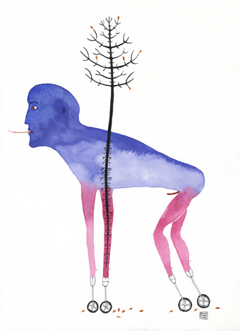 Balint Zsako was born in Budapest, Hungary, in 1979. Balint was largely raised in Canada (he received his BFA at Ryerson University in 2002), the Brooklyn-based Zsako is at this point best known for his quirky, vaguely sinister drawings in watercolour and ink on paper, and for his collages. His career has been on the upswing for a few years now—in 2009 the Museum of Contemporary Canadian Art in Toronto published a monograph of his drawings titled Balint Zsako: Works from the Bernardi Collection based on an exhibition of the previous year—and this spring he had overlapping New York exhibitions of his work at Mulherin + Pollard and the Proposition.